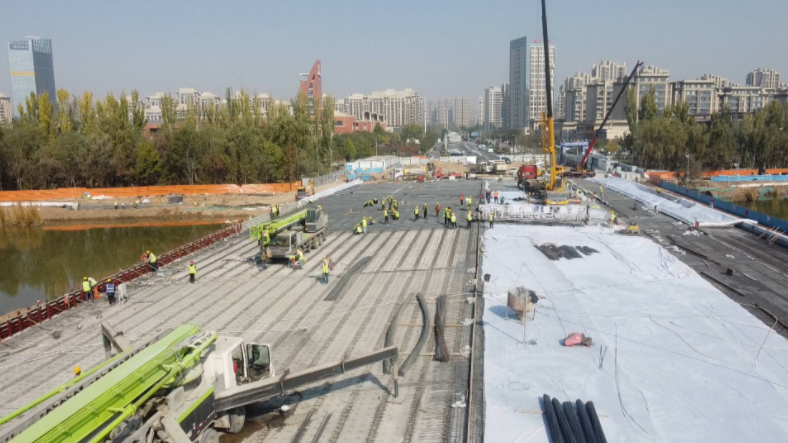 在项目施工现场,施工设备和人员正在进行桥面系的施工,包含护栏底座、桥面铺装层,以及贺兰山路口路基路面等施工。放眼望去,整个桥梁全体的结构已然构成。据介绍,项目施工进度已达到总工程量的90%。